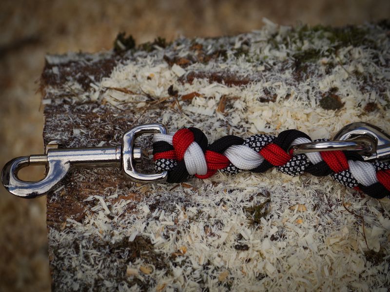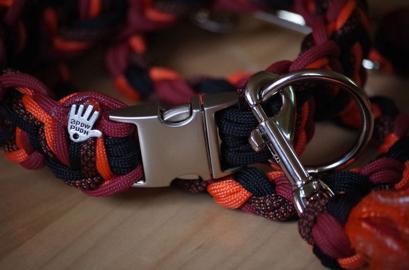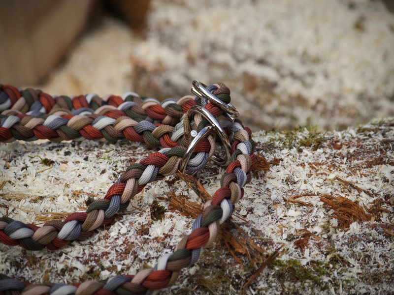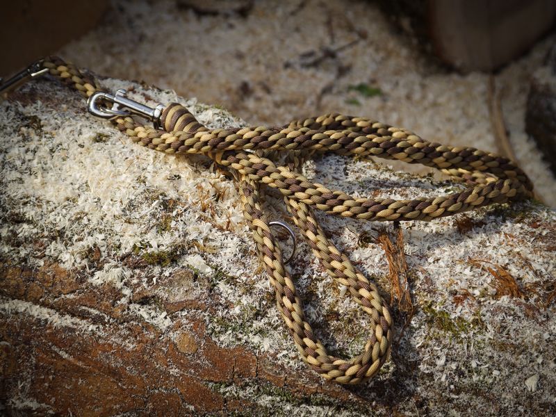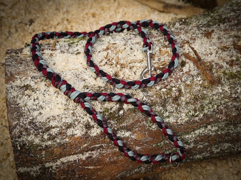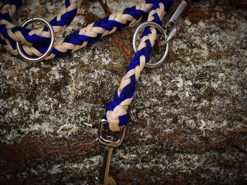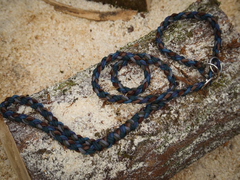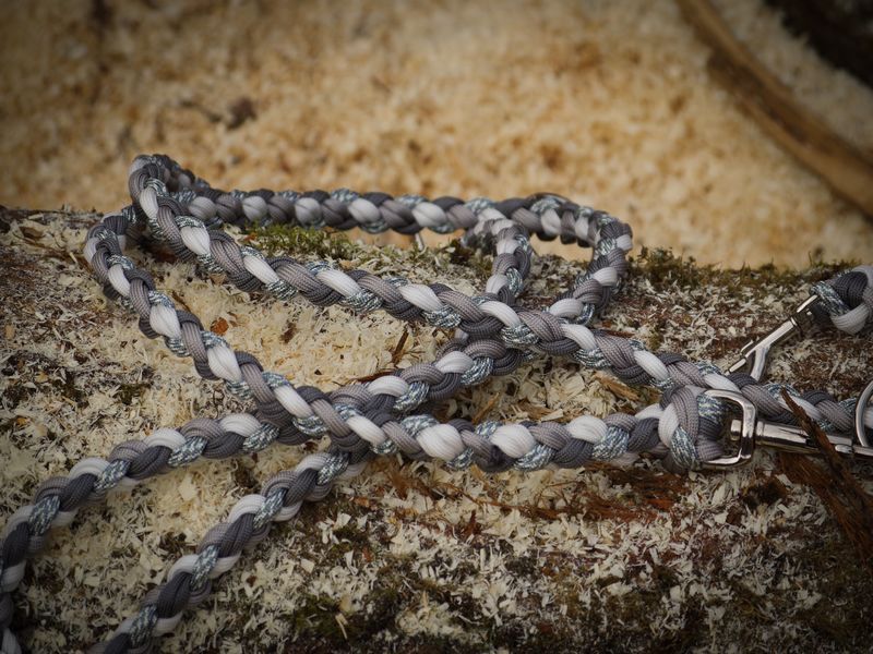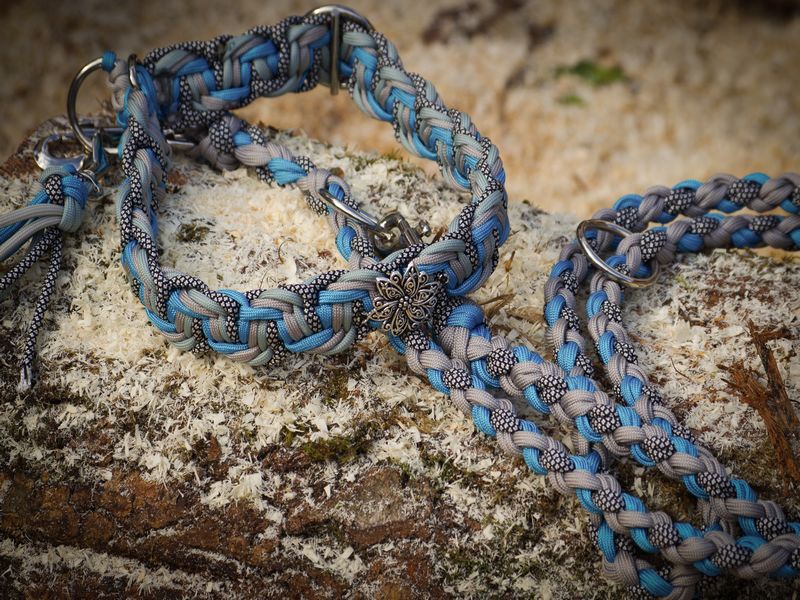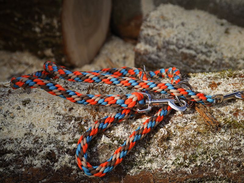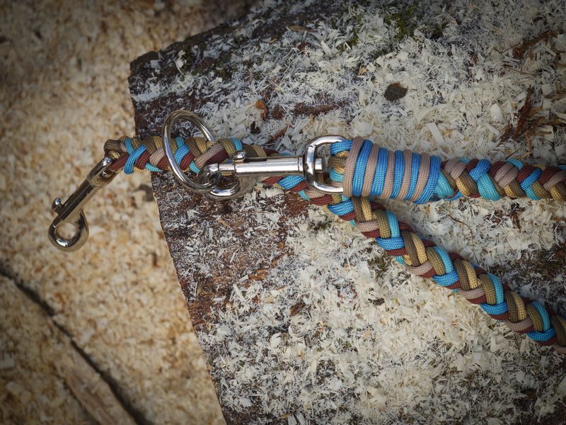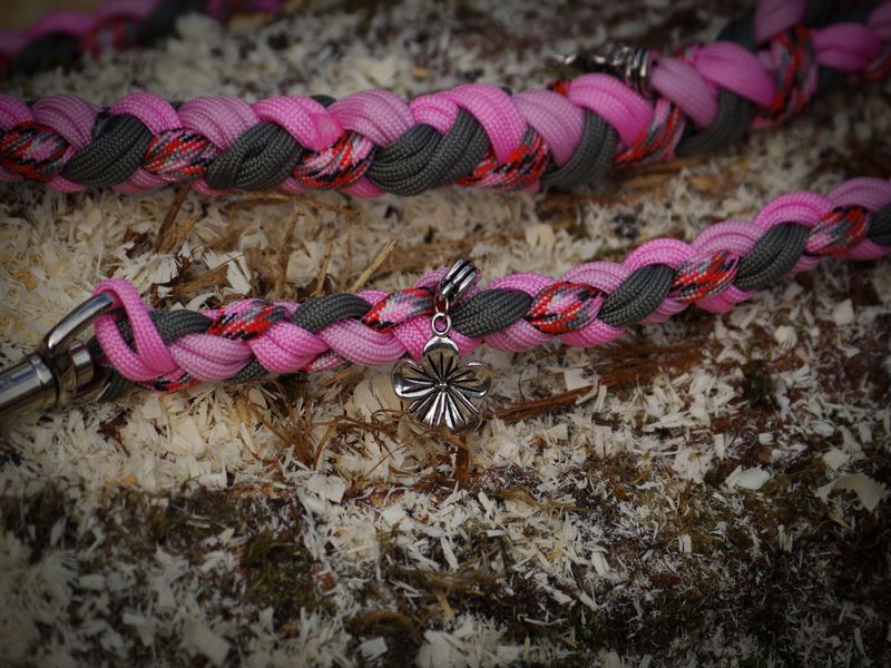 Paracord ist ein sehr vielseitiges Material. Meine Leinen/ Halsbänder sind aus Paracord 550 (TypIII, ein Strang hat eine Mindestbruchlast von 249 kg) gefertig. Es ist sehr pflegeleicht, reißfest, robust, trocknet sehr schnell und ist bei 30° in der Waschmaschine waschbar. Paracord kann des Weiteren nicht schimmeln oder modern.