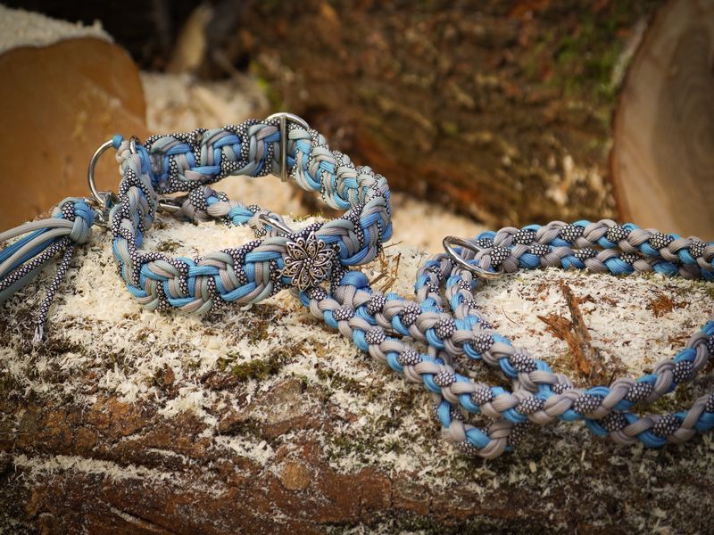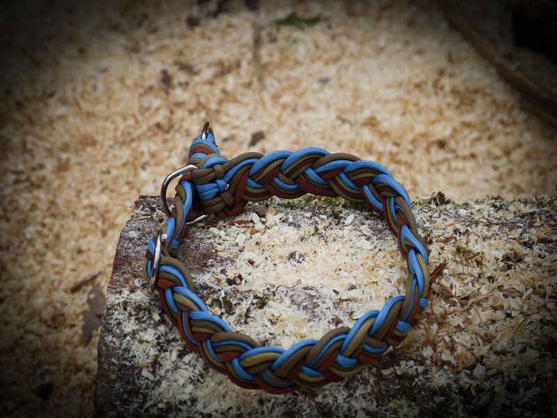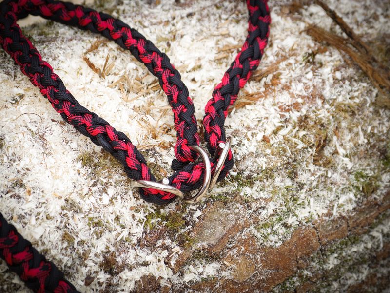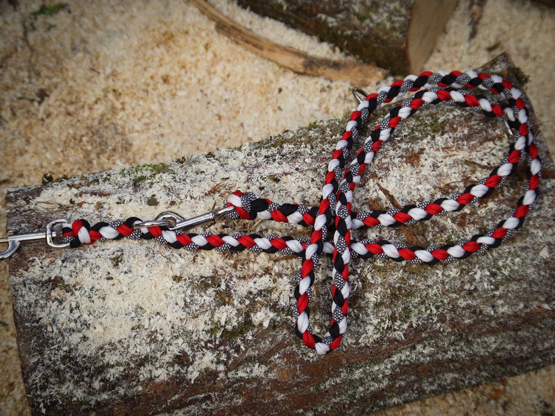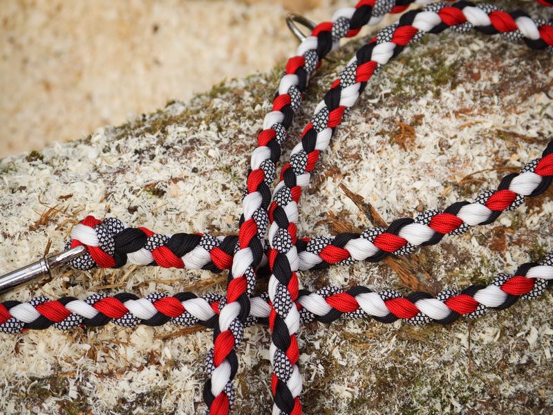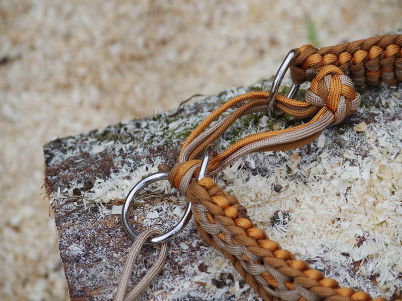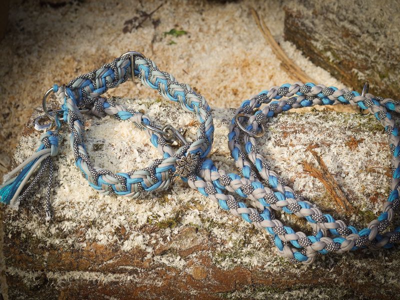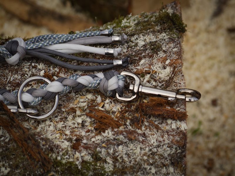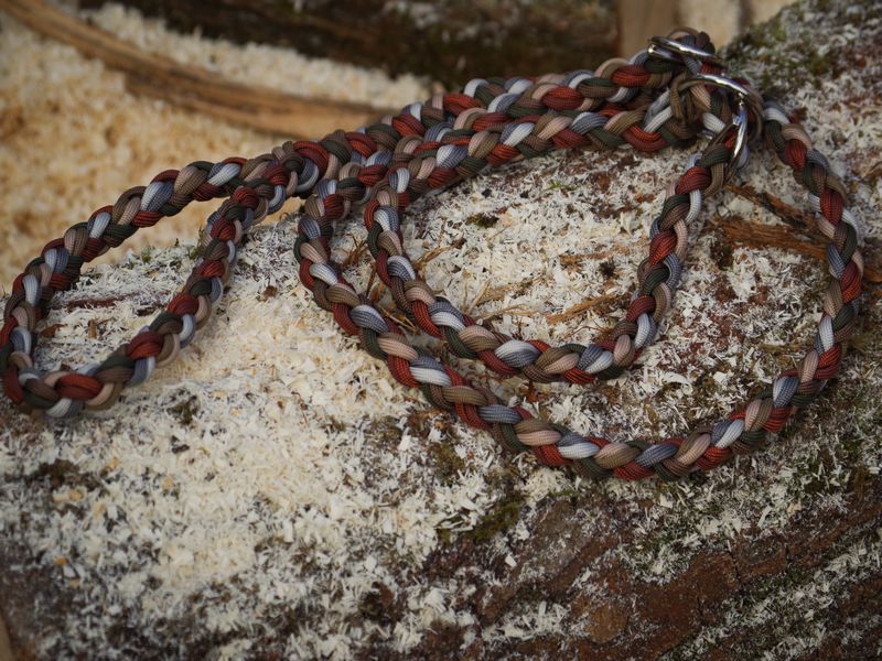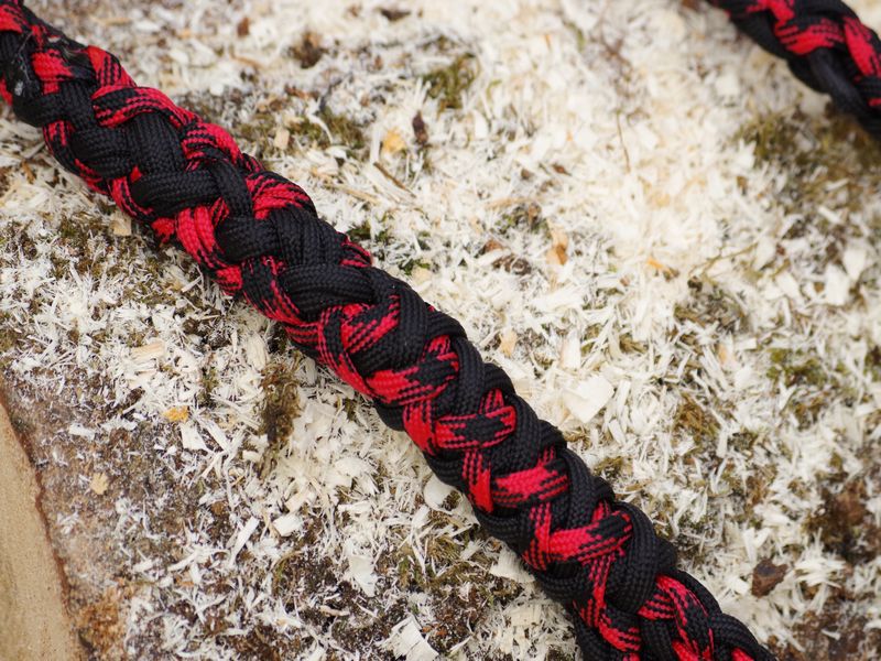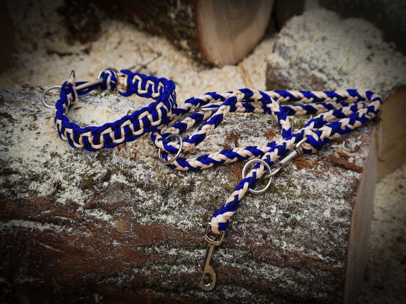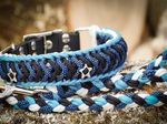 Paracord ist ein sehr vielseitiges Material. Meine Leinen/ Halsbänder sind aus Paracord 550 (TypIII, ein Strang hat eine Mindestbruchlast von 249 kg) gefertig. Es ist sehr pflegeleicht, reißfest, robust, trocknet sehr schnell und ist bei 30° in der Waschmaschine waschbar. Paracord kann des Weiteren nicht schimmeln oder modern.