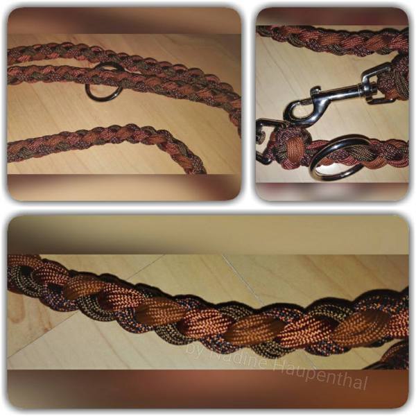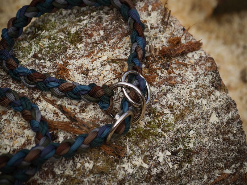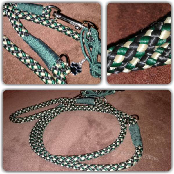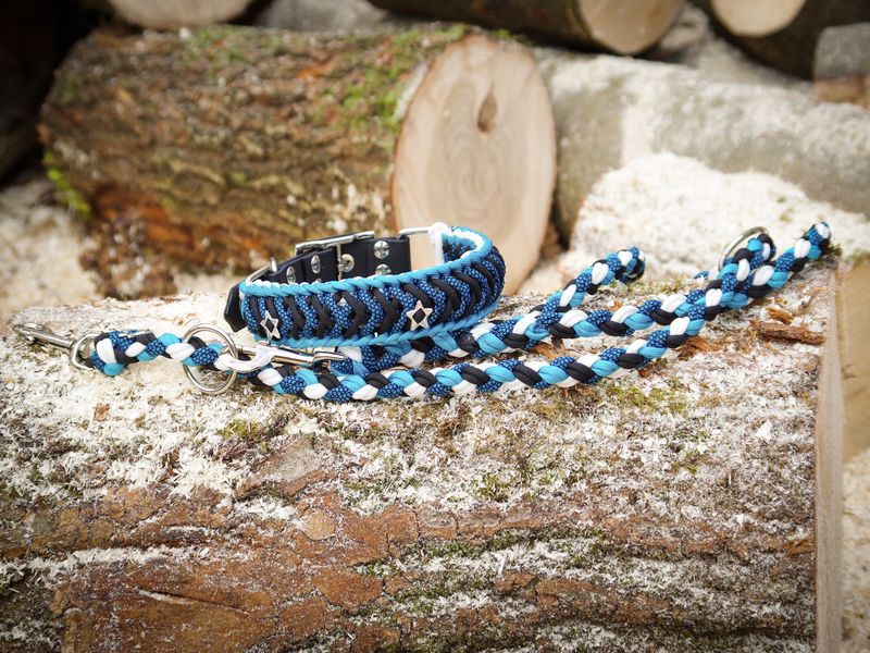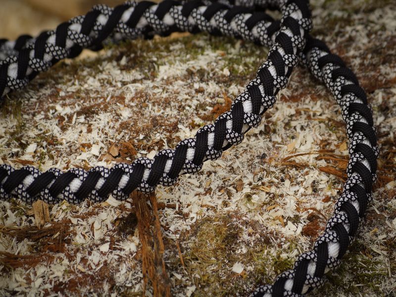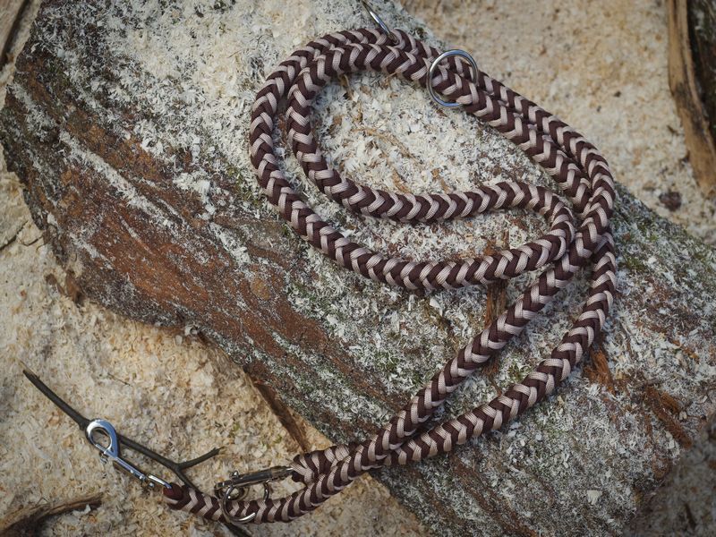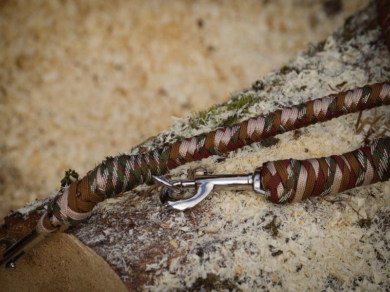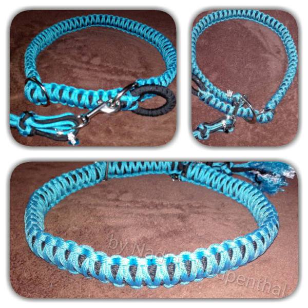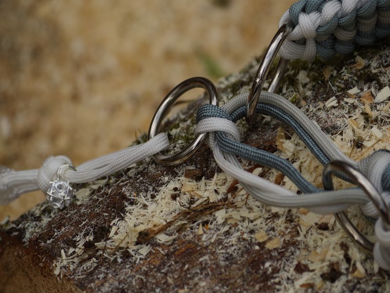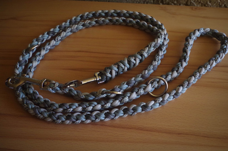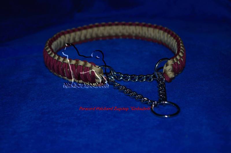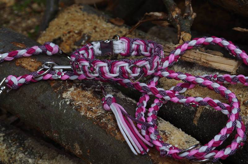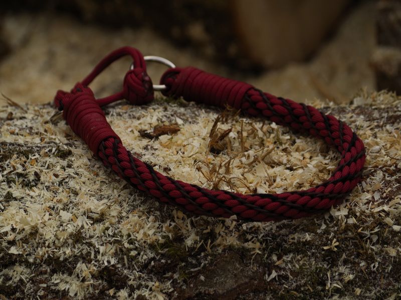 Paracord ist ein sehr vielseitiges Material. Meine Leinen/ Halsbänder sind aus Paracord 550 (TypIII, ein Strang hat eine Mindestbruchlast von 249 kg) gefertig. Es ist sehr pflegeleicht, reißfest, robust, trocknet sehr schnell und ist bei 30° in der Waschmaschine waschbar. Paracord kann des Weiteren nicht schimmeln oder modern.