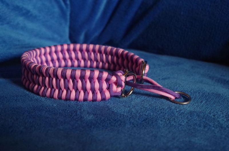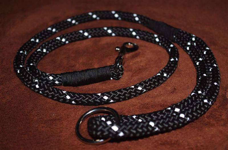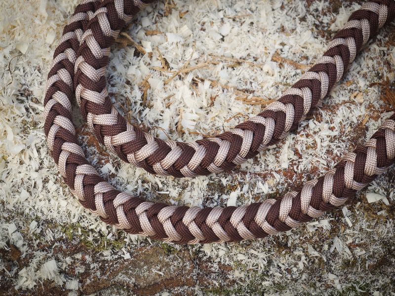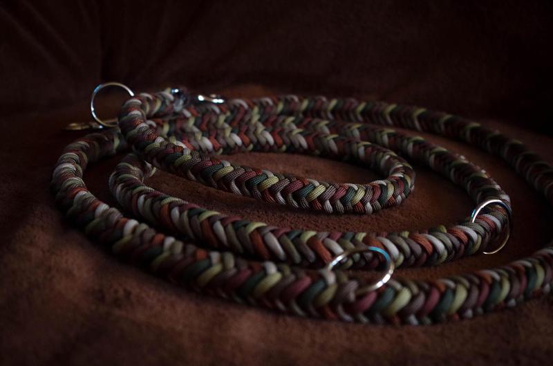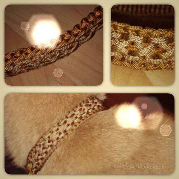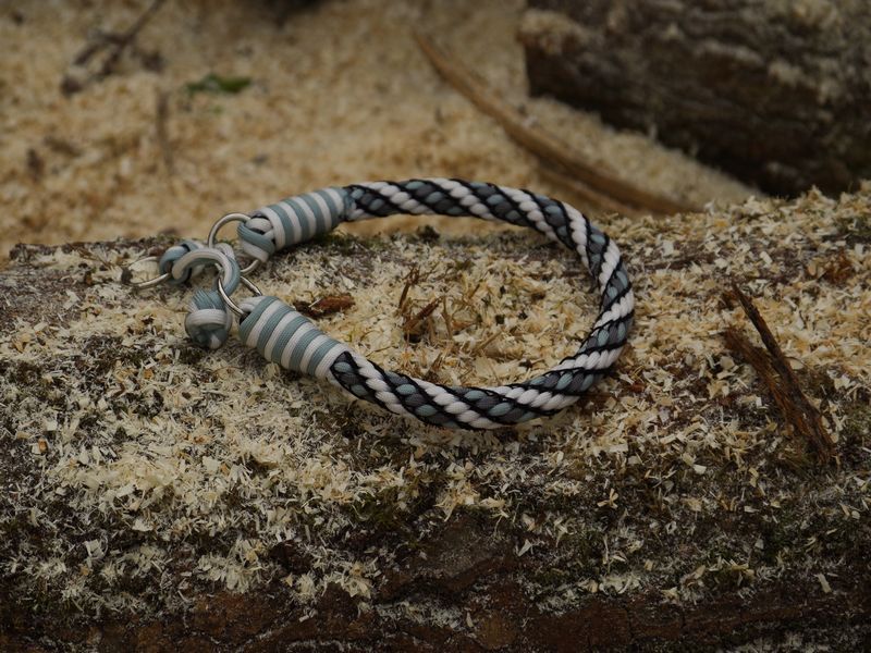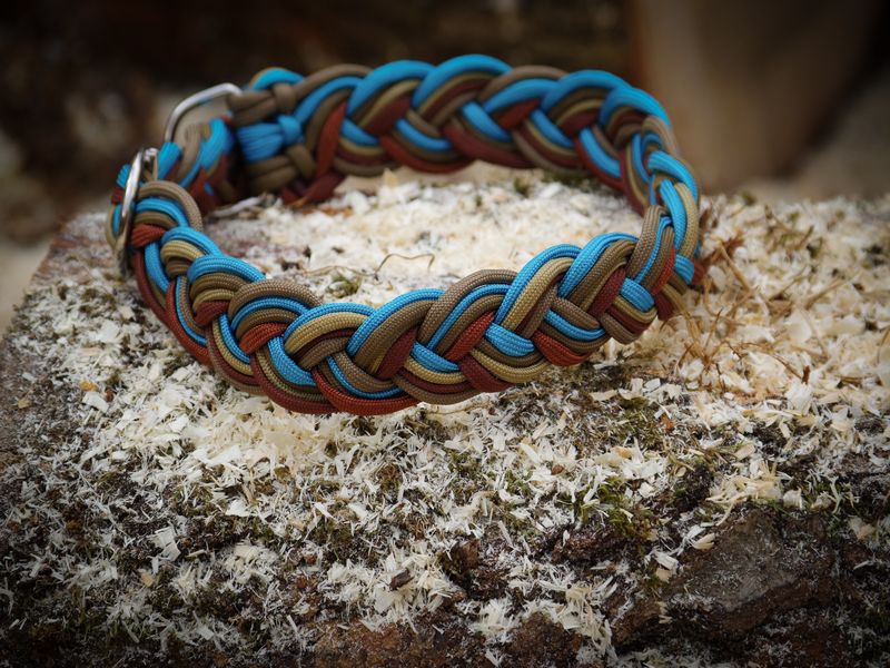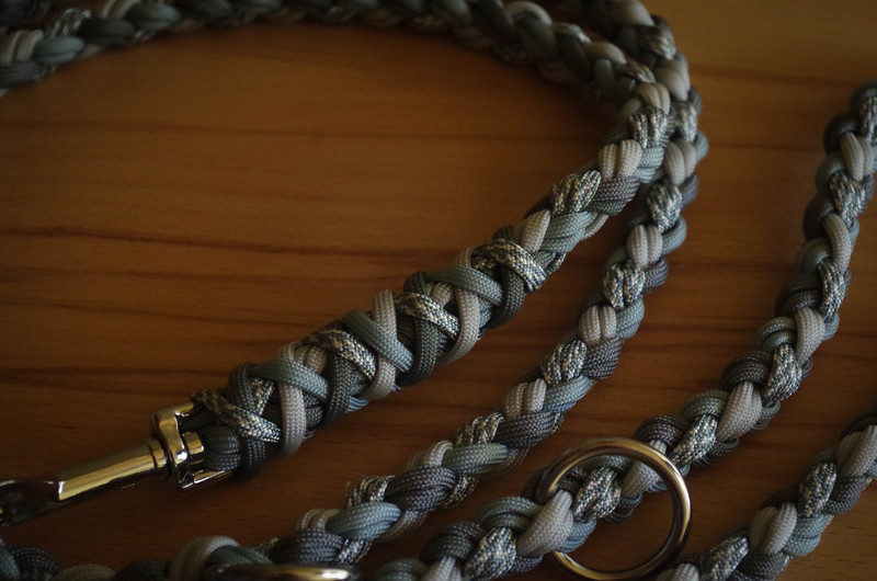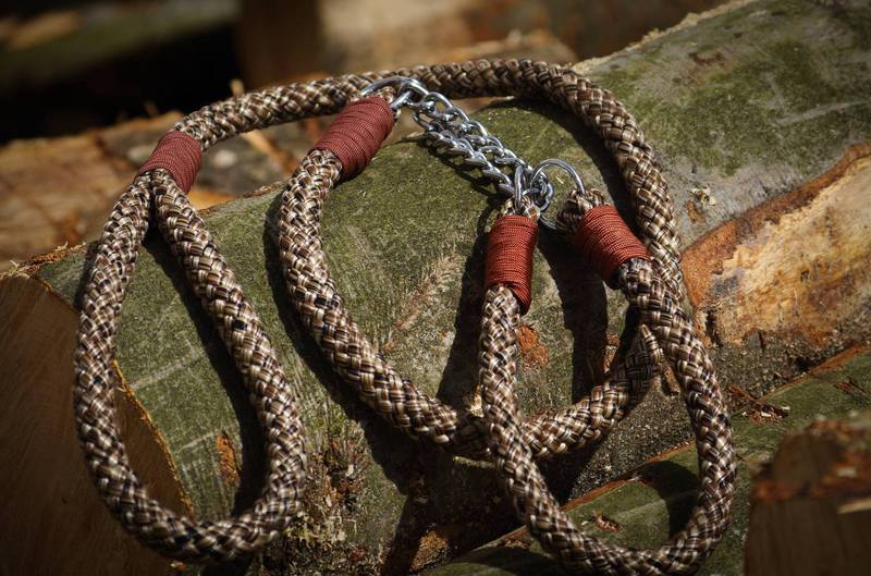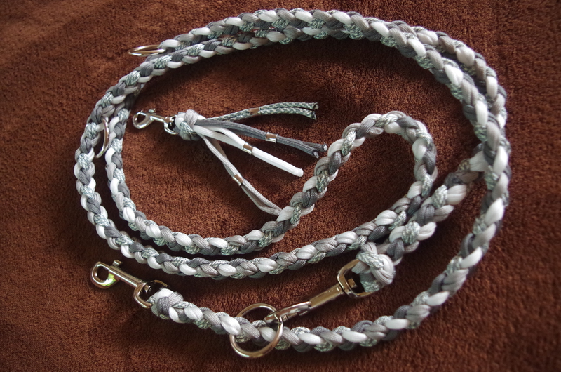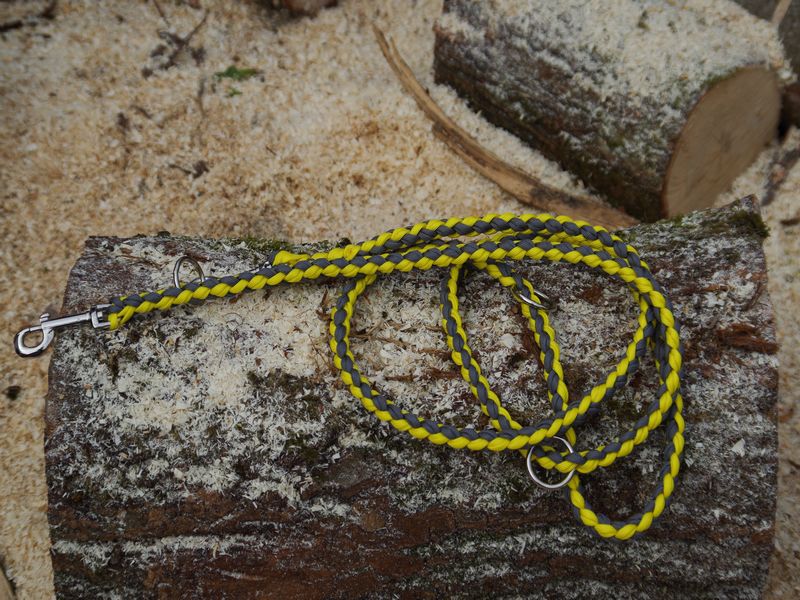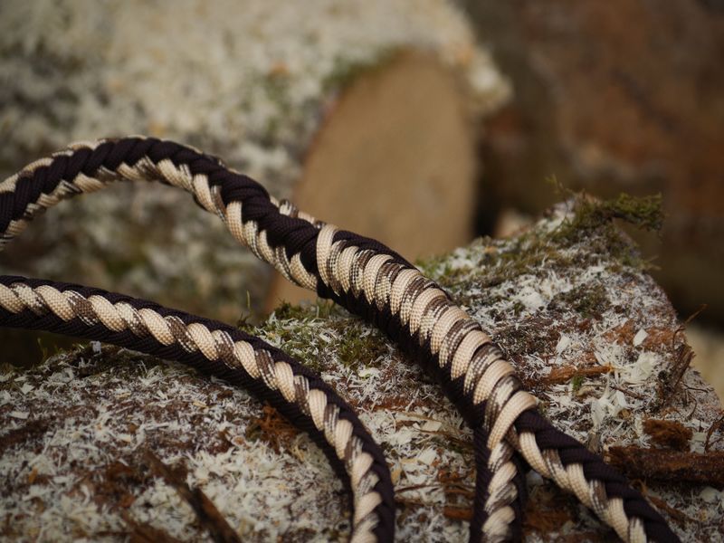 Paracord ist ein sehr vielseitiges Material. Meine Leinen/ Halsbänder sind aus Paracord 550 (TypIII, ein Strang hat eine Mindestbruchlast von 249 kg) gefertig. Es ist sehr pflegeleicht, reißfest, robust, trocknet sehr schnell und ist bei 30° in der Waschmaschine waschbar. Paracord kann des Weiteren nicht schimmeln oder modern.